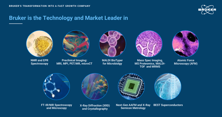 Bruker (BRKR) makes very specialized scientific instruments—like advanced NMR machines and mass spectrometers—that scientists use for cutting-edge research in fields such as cell biology and genomics. Many of these are one-of-a-kind or highly specialized tools, built for the unique needs of leading research labs and universities.