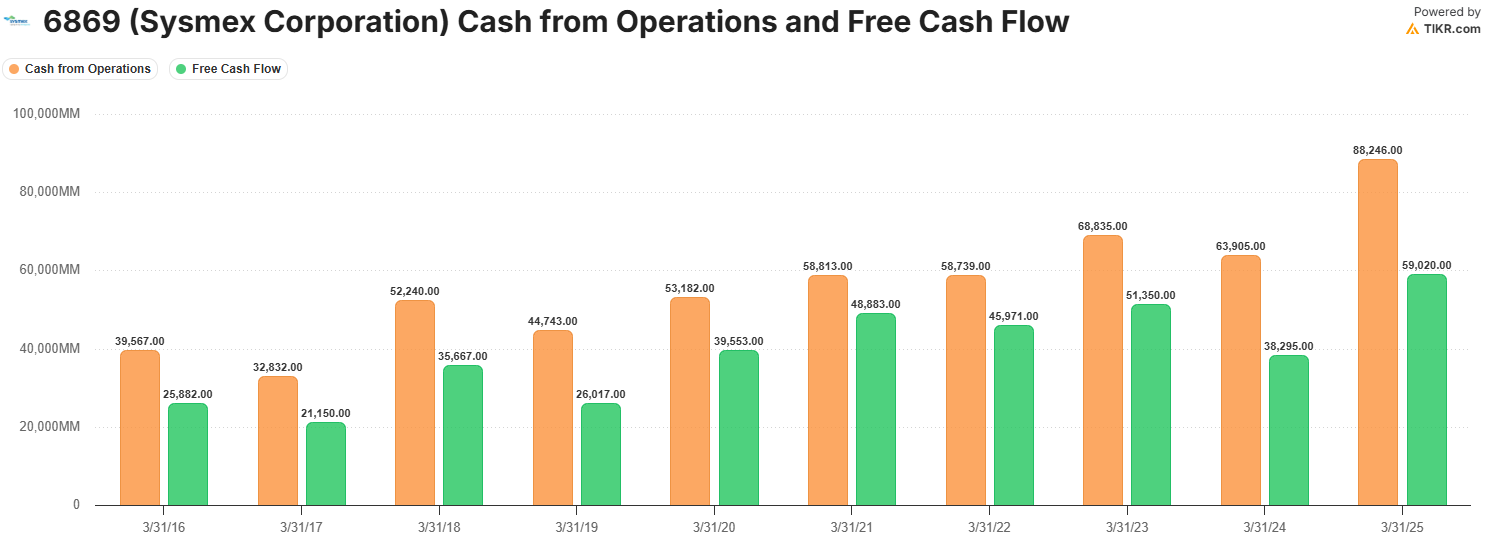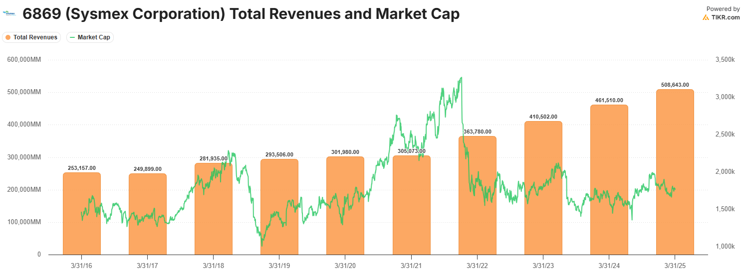Sysmex has also moved into surgical robotics through its Medicaroid/Hinotori venture, aiming at the same space dominated by Intuitive Surgical. Hinotori is already approved and in clinical use in Japan, with initial approvals in markets like Singapore and Malaysia, and Sysmex is pushing for a broader rollout. The value pitch is straightforward: a more compact, user-friendly robot in a post–Da Vinci patent world. Since its commercial start in 2020, the business has grown from about ¥0.7bn in sales and 18 units to roughly ¥5bn and 89 units shipped by 2025, with a target of 100 units by year-end—still only around US$30m+ at the group level, so financially tiny. But the trajectory matters: it shows Sysmex is still willing to invest, experiment, and build in technically demanding areas, which is very consistent with how they’ve compounded in diagnostics over the past two decades, even if this shouldn’t be a core part of the investment case yet.