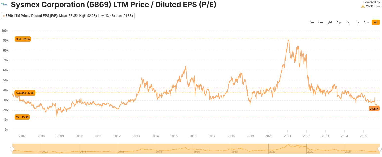 Combining the above points, all at a time when the stock has been weighed down by China-related headwinds and a few operational challenges—which I view as largely transitional and short-term—Sysmex now trades at a historically low valuation that offers an appealing entry point for long-term investors.