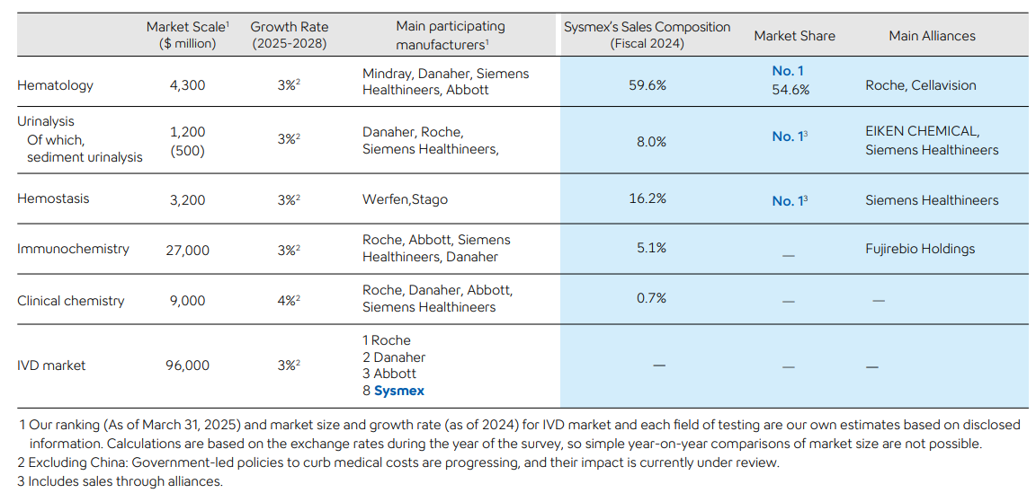 - Sysmex operates in IVD markets where a small number of players dominate globally. While giants like Roche compete broadly across core and highly specialized diagnostics, Sysmex focuses on niche yet routine segments—Hematology, Urinalysis, and Hemostasis—where testing volumes are high and switching costs are significant. In these areas, Sysmex holds dominant market positions, with roughly 40–50% share in each segment. These three specialties account for nearly 85% of Sysmex’s annual revenue and together represent about 9% of the overall IVD market (Hematology: 4.3bn, Urinalysis: 1.2B, Hemostasis: 3.2B out of a ¥96B IVD market), implying Sysmex controls around ~4-5% of the global IVD space through targeted leadership in its chosen domains.